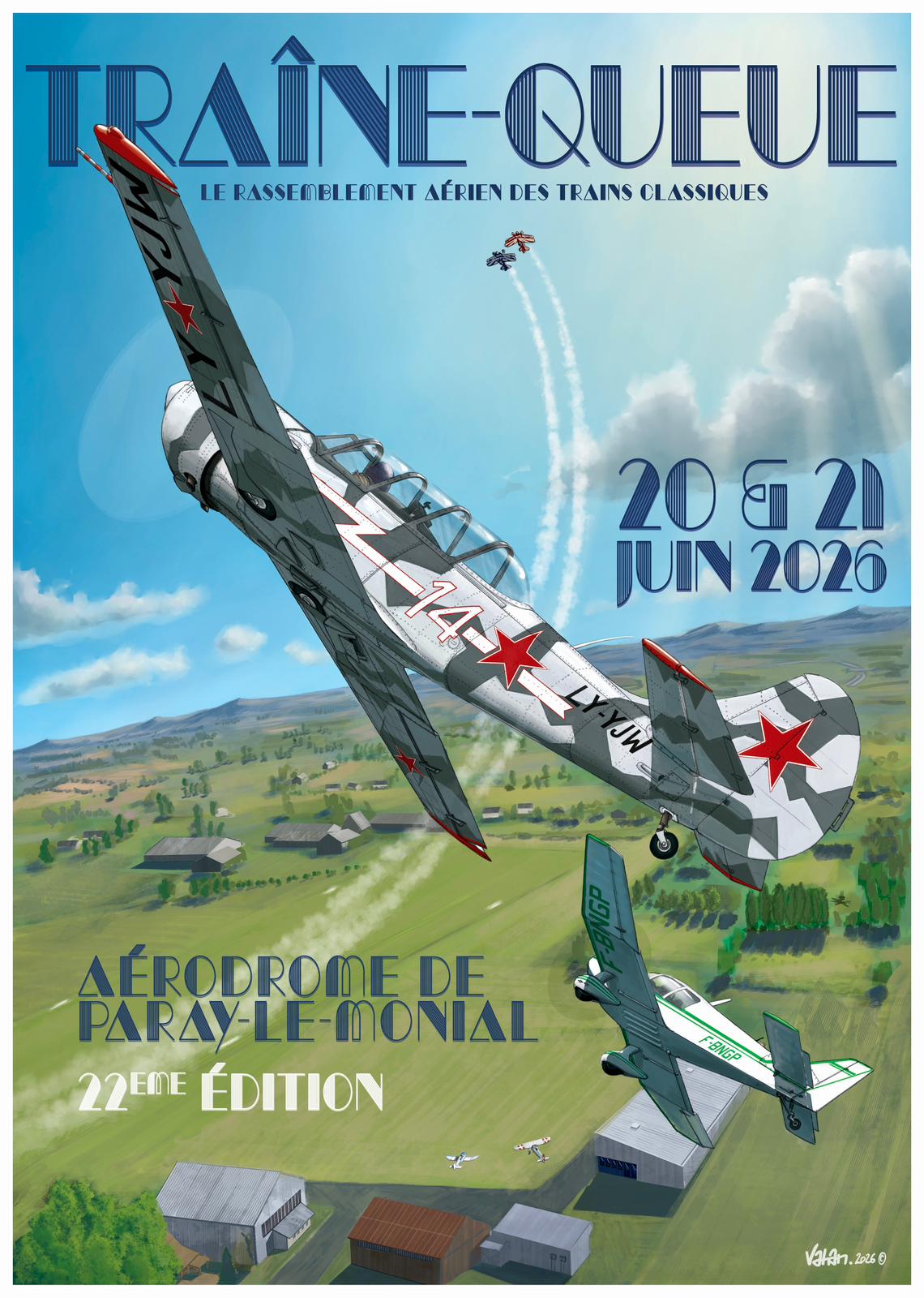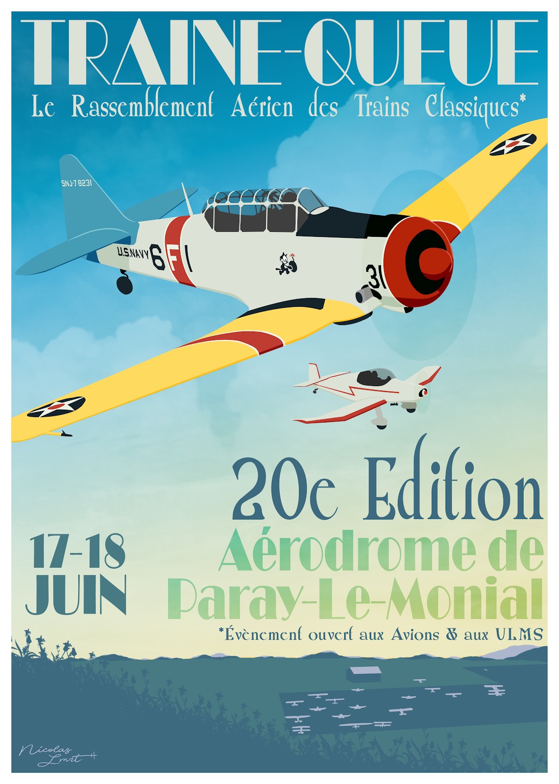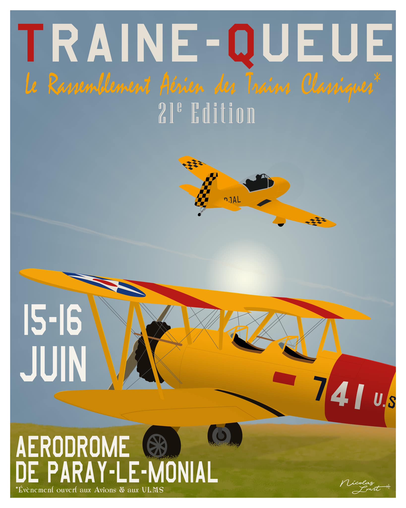 Dans le ciel parodien les ondes sont projetées au quatre coins de la rose des vents. Elles attrapent tout ce qu’elles peuvent dans leur cavalcade. Le cru s’annonce délicieux. Pour couronner le lancement de la 21ème édition, un nouvel artiste, lui aussi pilote et talentueux, fomente une affiche qui inscrit désormais les Traîne-Queue dans les grands évènements français. Le brillant Vahan nous transporte dans les années 30 où Stampe, Bücker, Piper et bien sûr le légendaire Stearman se partagent la vedette. Cette année on atteint un nouveau record, 160 aéronefs, la fine fleur de ce qui traîne sous les hangars de France et de Navarre. C’est dorénavant le chiffre magique : 160. L’aérodrome connaît son maximum de capacité. C’est un triomphe. Les membres du club doivent gérer maintenant plusieurs repas, du vendredi soir au dimanche midi, une soirée et une logistique millimétrée. Le tout en gardant l’esprit Traîne-Queue.