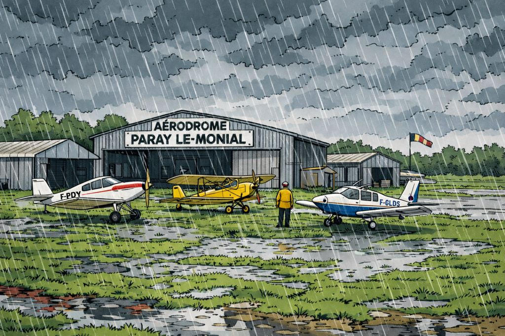 …Où plutôt dans l’arrière boutique des pistes et des taxiway humides, blottie au chaud dans un club house gracieusement orné, comme seuls les aéroclubs ont la recette magique. Aujourd’hui ça ne volera pas, le plafond est bas, la piste est détrempée, le ciel n’est guère propice aux escapades.