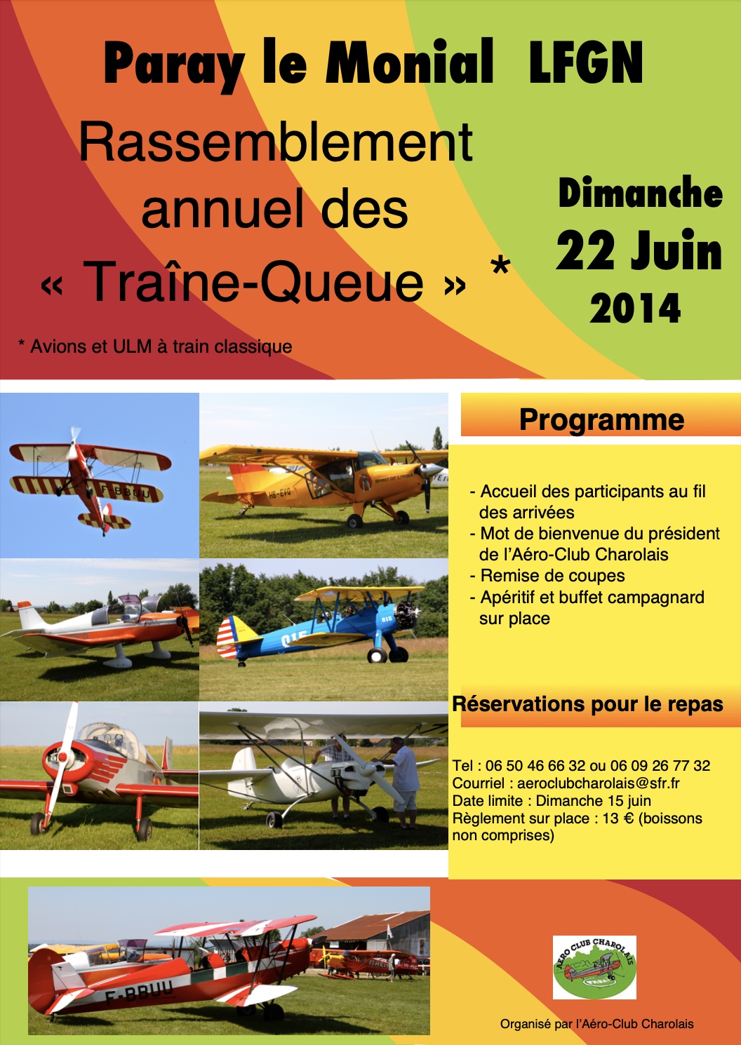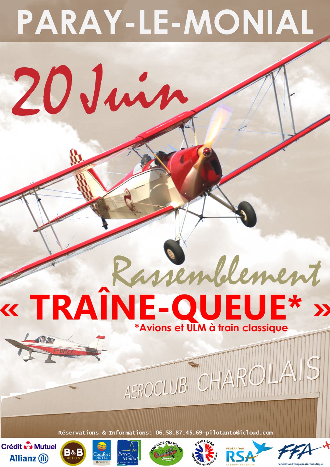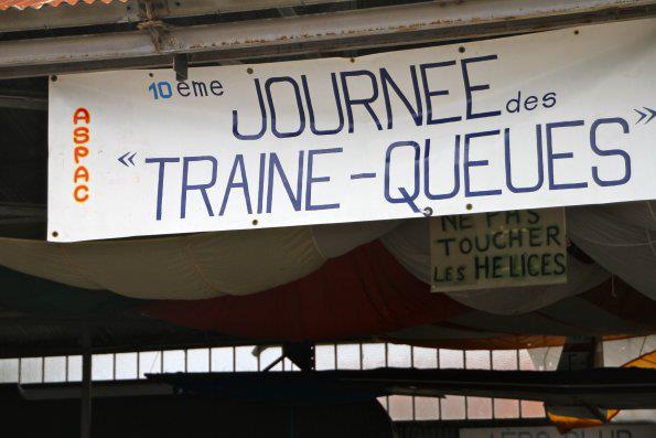 Pour le moment aucun bruit de moteur ne vient déchirer la quiétude du plateau de la Forêt. Oui la Forêt. C’est étrange pour un champ d’aviation mais au XVIIème siècle il y avait bien de grands bois en lieu et place de l’aérodrome qui furent rasés sur ordre de Louis XIV. On devait entreprendre la construction d’un monastère. Mais cinq siècles plus tard, en ce matin de juin, ce ne sont pas les moines que l’on entend chanter mais la douce mélodie d’un champ d’aviation qui se réveille. Les quelques compères présents dressent les tables, disposent les chaises, installent le bar. On roule le barbecue sur le parking. Sous la porte du vieux hangar Rouméas de 1968, on accroche fièrement la première banderole des Traîne-Queues. Mais d’ailleurs : Traîne-Queue, Traîne-Queues, ou Traînes-Queues ? Le sujet reste toujours aussi brûlant sous les tôles du hangar. Ni Bernard Pivot ni Laurent Romejko, pourtant largement consultés, n’ont départagé les aviateurs gaulois des collines charolaises. Alors aujourd’hui l’armistice à signé pour « Traîne-Queue ». Kamoulox.